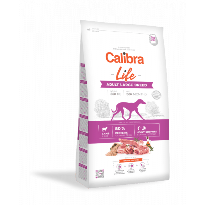 Calibra dog hypoalergenní kompletní granule pro dospělé psy velkých plemen (nad 30 kg) s jehněčím masem a rýží. Obsahují 80 % bílkovin živočišného původu. Receptura je zaměřena na péči o klouby a na podporu optimálního zažívání, kde hypoalergenní složení s nízkým obsahem obilovin (pouze rýže) je vhodné i pro citlivé zažívání. Velikost granulí je přizpůsobena fyziologické potřebě velkých psů. Kvalitní jehněčí protein je součástí bílkovin živočišného původu. Ten tvoří celých 80 % z celkového obsahu bílkovin v receptuře. Chondroprotektiva průběžně pečují o namáhaný kloubní aparát psů velkých plemen a o správnou funkci trávicího traktu se postarají prebiotika.Také extrakt z Yuccy schidigera podporující střevní mikroflóru a výrazně redukující plynatost v zažívacím traktu. Funkce hlavních aditiv: chondroprotektiva - (chondroitin sulfát a glukosamin) – vyživují chrupavku a zpomalují proces jejího opotřebení. vitaminy a chelátové minerály (vysoce využitelná organická forma minerálů) – pro správnou funkci organismu, prevenci onemocnění a posílení imunitního systému. frukto-oligosacharidy a mannan-oligosacharidy (FOS, MOS) jsou prebiotika podporující střevní mikroflóru, správnou funkci trávicího traktu a posilující imunitní systém. Yucca schidigera - obsahuje chlorofyl, stopové prvky, vitaminy, saponíny a polyfenoly. Má detoxikační účinky, působí pozitivně na trávicí trakt, snižuje plynatost a zápach exkrementů. Složení: jehněčí bílkoviny (36 %), rýže (34 %), pivovarská rýže (10 %), drůbeží tuk (7 %, konzervováno tokoferoly), sušená jablečná dužina (5 %), kvasnice, hydrolyzovaná kuřecí játra (2 %), lososový olej (2 %), prebiotika (mannan-oligosacharidy 120 mg/kg, ß-glukany 100 mg/kg, frukto-oligosacharidy 70 mg/kg), glukosamin (260 mg/kg), sušený rozmarýn a tymián (200 mg/kg), chondroitinsulfát (160 mg/kg), Yucca schidigera (80 mg/kg), Lactobacillus acidophilus HA – 122 inaktivovaný (15 × 109 buněk/kg).