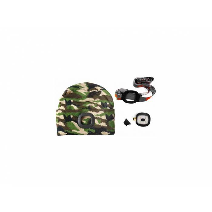 Čepice s LED světlem - maskovací Materiál - 100% acrylic Nabíjení baterie přes USB Nabíjecí výkon: 0,5W Nabíjecí napětí: 5V Kapacita baterie: 300mAh Výkon LED diody: 1W 3 stupně svítivosti LED diody Součástí balení čelový pásek pro použití LED světla bez čepice Výdrž: nejvyšší svítivost cca 45 minut střední svítivost cca 60 minut nejnižší svítivost cca 75 minut Před praním je nutné LED světlo z čepice vyjmout.