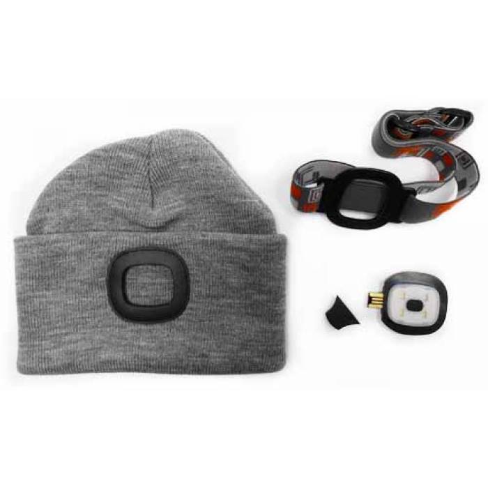 Čepice s LED světlem - šedá Materiál - 100% acrylic Nabíjení baterie přes USB Nabíjecí výkon: 0,5W Nabíjecí napětí: 5V Kapacita baterie: 300mAh Výkon LED diody: 1W 3 stupně svítivosti LED diody Součástí balení čelový pásek pro použití LED světla bez čepice Výdrž: nejvyšší svítivost cca 45 minut střední svítivost cca 60 minut nejnižší svítivost cca 75 minut Před praním je nutné LED světlo z čepice vyjmout.