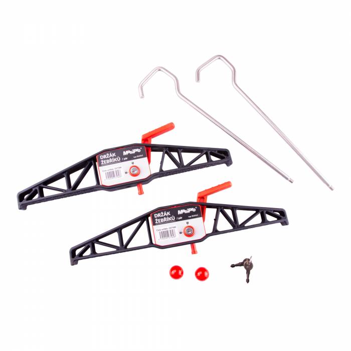 upínací systém na žebříky na střechu auta, pár • snadné, rychlé a bezpečné upevnění žebříků na každém střešním nosiči • bezpečné: zamykací, v balení dva klíče • pro upevnění 2 a 3dílných žebříků • materiál tvrzený plast/nerez • odolné vůči korozi, dlouhá životnost • CE • certifikováno pr.EN 131-5:2004, nosnost 50kg • délka háku: 420mm • rozměr plochy plastového držáku: 455x45mm • váha 2kg