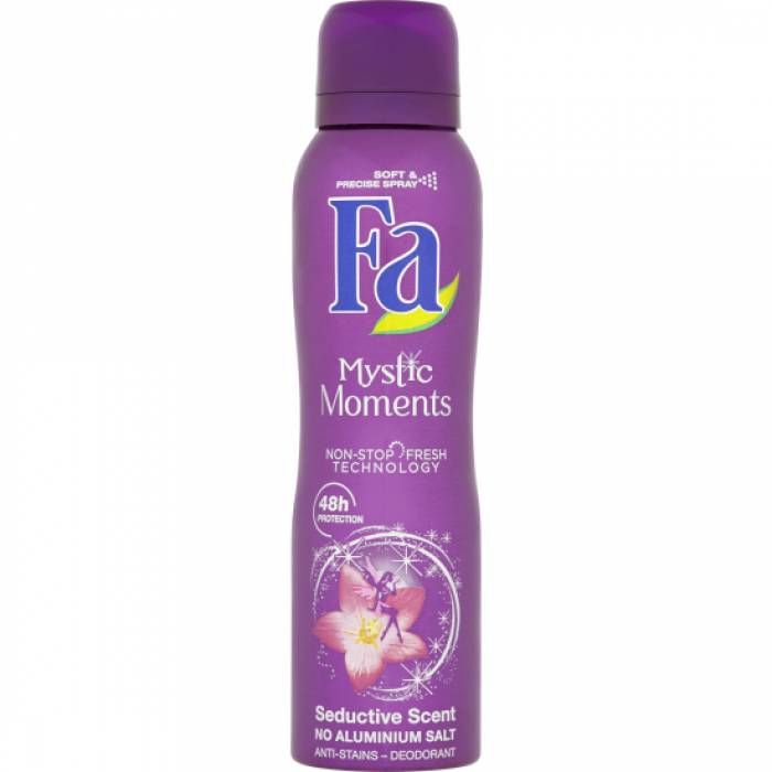 Fa Mystic Moments a jeho dlouhotrvající svůdná vůně mučenky, která uchvátí Vaše smysly s tajemným okouzlujícím tónem. Aktivní komplex svěžesti bojuje proti pachu a zajišťuje dlouhotrvající ochranu. Technologie Non-Stop Fresh pro až 48h deo ochranu. Vlastnosti: S vůní mučenky. Bez hliníkových aluminiových solí.Chrání proti pocení a zápachu po dobu až 48 hodin.Přípravek je vhodný pro všechny typy pokožky. Použití: Sprej držte kolmo a aplikujte do podpaží ze vzdálenosti ne menší než 15 cm. Složení: Butane, Alcohol denat., Propane, Isobutane, Triethyl citrate, Parfum, Phenoxyethanol, Polyglyceryl-3 caprylate, Hexyl cinnamal, Butyloctanoic acid, Alpha-isomethyl ionone, Geraniol, Menthyl acetate, Citronellol, Limonene, Benzyl alcohol, Coumarin.
