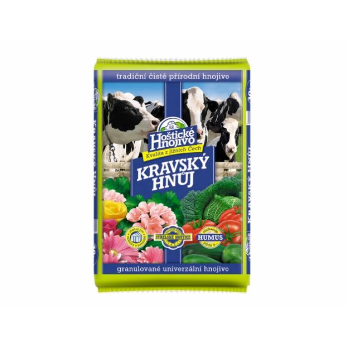 Kravský hnůj * Složení: * organické hnojivo vyráběné z kravského hnoje pomocí procesu sušení a lisování. * Pro snadnou manipulaci a použití je dodáváno v granulované formě. * Určení: * k základnímu hnojení před výsadbou rostlin vyžadujících organické hnojení (brambory, řepa, celer, brukvovitá, plodová zelenina). * Také pro vyhnojení květinových záhonů, při přípravě půdy před výsadbou stromů a keřů.