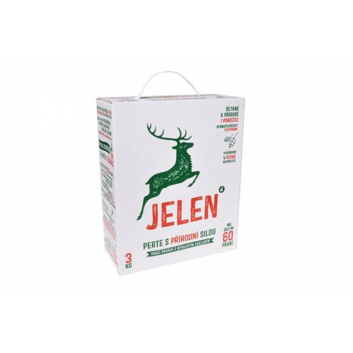 Jelen mýdlový prací prášek 3kg Jelen mýdlový prací prášek pere i za vysokých teplot. Obsahuje kousky jádrového mýdla, což zvyšuje jeho účinnost, k vaší pokožce však zůstává co nejšetrnější, což je doloženo i klinickým testováním SZÚ, dle kterého je prášek nedráždivý k pokožce a tedy vhodný i na praní oblečení osob s citlivou pokožkou a dětí do tří let. Složení: 15% nebo více, avšak méně než 30%: Mýdlo 5% nebo více, avšak méně než 15% Aniontové povrchové aktivní látky.