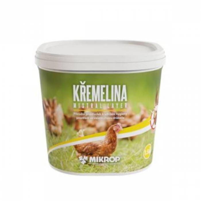 Mikrop Křemelina 5kg Přírodní prostředek k udržení správné hygieny prostředí a zamezení výskytu čmelíka kuřího v chovech drůbeže. Křemelina se specifickou frakcí obohacená o esenciální oleje, určená speciálně pro potlačení výskytu roztočů v chovech drůbeže. Složení: diatomická zemina (křemelina), montmorillonit, esenciální oleje, řasy. Použití: Použití i za přítomnosti drůbeže výhradně v suché formě. Aplikujte ručně nebo pomocí aplikátoru na povrch v kurníku – důraz klademe na místa odpočinku a snášky. Lze použít i jako náplň do popeliště. Orientační množství je 20g na 1ks drůbeže v závislosti na situaci v chovu. Doporučení: Po první aplikaci doporučujeme provést ještě jednu po 7–10 dnech. Vzhledem k přirozené povaze a prašnosti přípravku doporučujeme během aplikace respirátor. Jednorázové nadýchání však není ze zdravotního hlediska nebezpečné. Skladujte na suchém místě. Určeno k zevnímu použití.