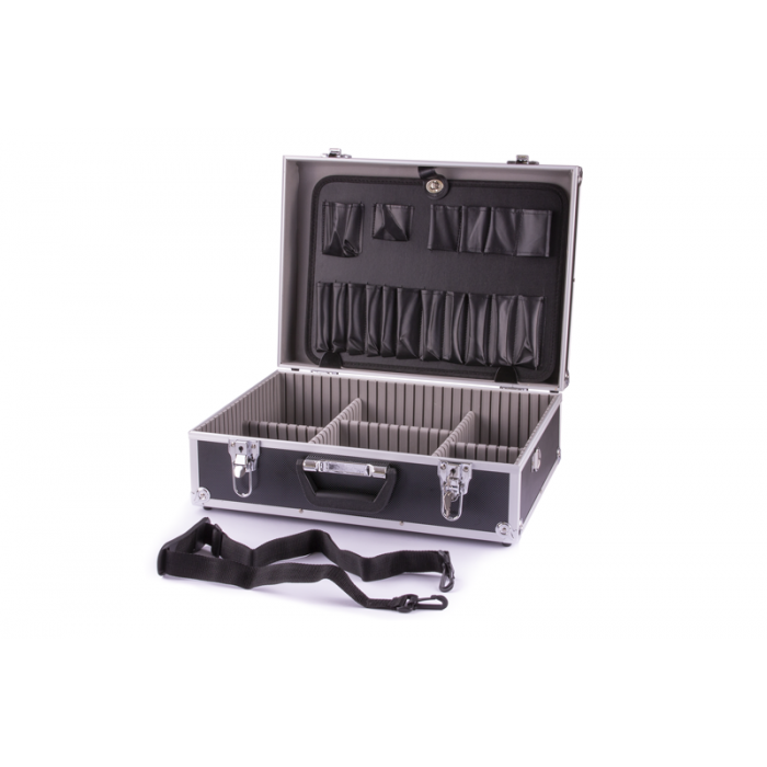 - hliníkový kufr s organizérem - nastavitelné vnitřní přihrádky umožňují libovolně přestavět na oddíly - ve víku je sklopná deska, oboustranně osazená poutky a kapsami - nosnost 5 kg - popruh přes rameno - uzamykatelný
