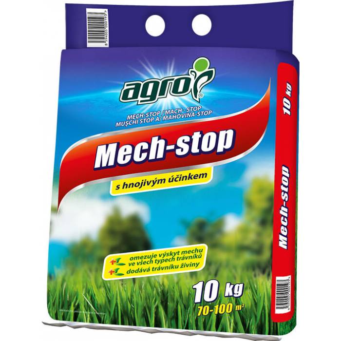 Mech-stop je velmi účinný přípravek pro likvidaci mechu v trávníku s hnojivým účinkem, působením přípravku proti mechu dochází k zaschnutí mechového porostu v trávníku. Následně mech snadno odstraníte z travního porostu. Obsažená hnojiva s dusíkem a železem způsobují syté zabarvení trávníku a jeho rychlejší regeneraci. Holá místa jsou po odstranění mechu rychle zapojena do základního porostu. Mech-stop se používá k ničení mechu zejména v období časného jara. Jako prevenci proti opakovanému výskytu mechu v trávníku lze použít například dusíkaté vápno snižující kyselost půdy.