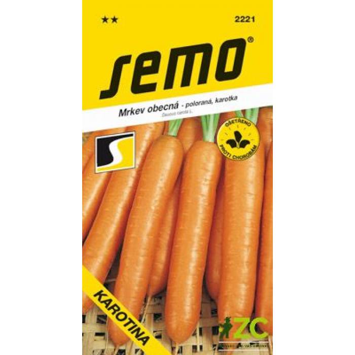 Mrkev Karotina vyžaduje lehčí až střední a dostatečně hlubokou v dobře zpracované půdě. Na mělké nebo na podzim nedostatečně prokypřené půdy reaguje mrkev nevzhlednými, krátkými, často rozvětvenými kořeny. Velmi kvalitní kořeny získáme pěstováním na hrůbcích nebo v hluboce prokypřených půdách. Nemá rada čerstvé organické hnojení, pěstuje se převážně v druhé trati. Podle použití mrkve a požadované doby sklizně volíme odrůdy i termíny setí. Rané odrůdy pro letní a podzimní sklizeň Tyto odrůdy se sejí co nejdříve na jaře se sklizní v letních měsících převážně pro přímý konzum, nebo v polovině června se sklizní v říjnu a využitím nejen k přímému konzumu, ale i ke skladování. HTS: 0,8 – 1,3 g V 1 g: 800 – 1200 semen Spon: 20 – 30 x 3 - 5 cm Výsev: březen – červenec Sklizeň: červen – říjen Odrůda: KAROTINA– je kvalitní odrůda polorané mrkve určená pro přímý konzum, ale také i krátkodobé skladování. Kořen je mírně kónický a tupě zakončený. Povrch kořene je hladký, intenzivně vybarvený. Dužnina je oranžově červená, jemné chuti. Srdíčko má stejné intenzivní vybarvení jako kůra. Kořen je velmi odolný k praskání a zelenání kořenových hlav. Vegetační doba 100 – 120 dní. Odrůda je odolná k vybíhání do květu. Ze 100 m2 lze sklidit 400 – 450 kg kořenů.