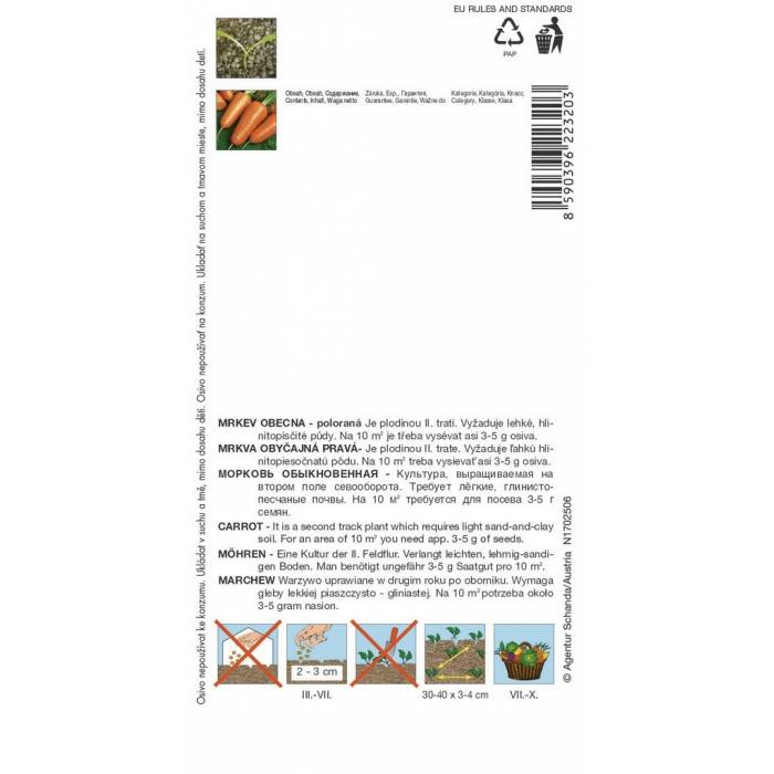 Mrkev Royal Chantenay 2 poloraná odrůda mrkve, kořeny jsou robustní, krátké a široké. Mají široce trojúhelníkový tvar s tupě špičatým zakončením. Rané odrůdy pro letní a podzimní sklizeň Tyto odrůdy se sejí co nejdříve na jaře se sklizní v letních měsících převážně pro přímý konzum, nebo v polovině června se sklizní v říjnu a využitím nejen k přímému konzumu, ale i ke skladování. HTS: 0,8 – 1,3 g V 1 g: 800 – 1200 semen Spon: 20 – 30 x 3 - 5 cm Výsev: květen – začátek července Sklizeň: srpen – říjen