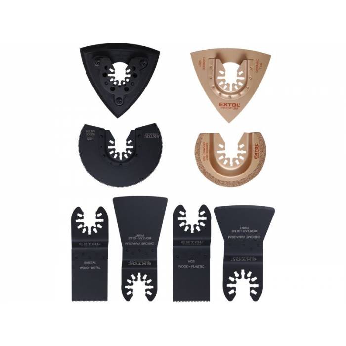 Hlavní technické parametry: Informační text: Upínací systém nástrojú umožňuje použití v oscilačních přístrojích různých značek, jako např. AEG, Black & Decker, Bosch, Dremel, Einhell, Extol, Fein, Makita, Milwaukee, Multi Master, PowerUp, Ridgid, Rockwell, Skil, Worx, Yato a dalších. podrobný popis: HSS segmentový pilový kotouč pr. 88mm, HCS zanořovací pilový list 34mm, BIM zanořovací pilový list 34mm, pevná špachtle 30mm, ohebná špachtle 49mm, karbidový řezný kotouč pr. 63,5mm, karbidová delta rašple, delta deska pro uchycení brusných papírů.