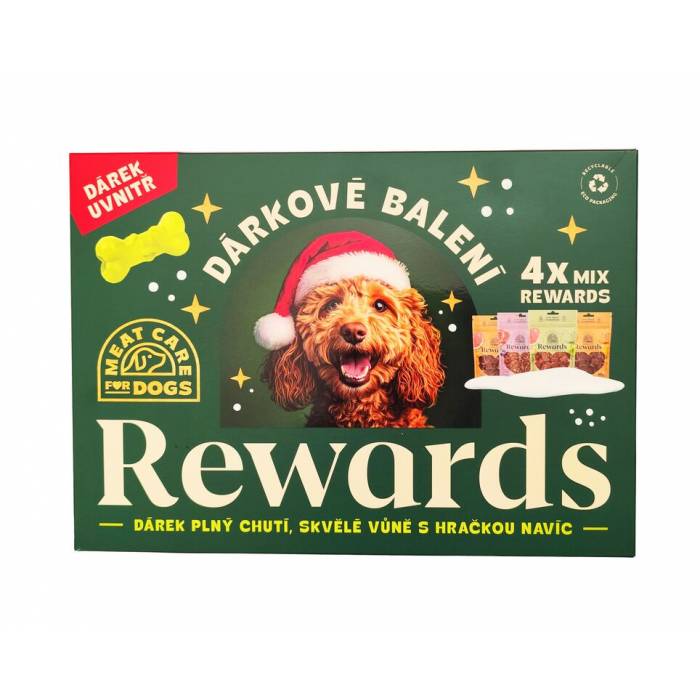 Hlavní přednosti pamlsků: vysoký podíl čerstvého masa, plně recyklovatelný obal, garance českého původu masa, unikátní chuť a vůně. Meat Care Rewards hovězí s borůvkou a tymiánem: Složení: 84 % masa a výrobků živočišného původu (z toho hovězí 42 %, kuřecí 28 %, vepřové 14 %), glycerin, celulóza, jablečná vláknina, sušená borůvka 1 % (ekvivalent čerstvé borůvky 4 %), sušený tymián 0,5 % (ekvivalent čerstvého tymiánu 3,5 %), chlorid sodný. Analytické složky: hrubý protein 30 %, hrubá vláknina 5,1 %, hrubý tuk 29 %, hrubý popel 2,4 %, vlhkost 12 %. Meat Care Rewards kuřecí s mrkví a bazalkou: Složení: 80 % masa a výrobků živočišného původu (z toho kuřecí 56 %, hovězí 13 %, vepřové 11 %), glycerin, celulóza, sušená mrkev 1 % (ekvivalent čerstvé mrkve 5 %), sušená bazalka 0,5 % (ekvivalent čerstvé bazalky 3,7 %), chlorid sodný. Analytické složky: hrubý protein 24 %, hrubá vláknina 11 %, hrubý tuk 16 %, hrubý popel 3,6 %, vlhkost 24 %. Meat Care Rewards vepřové s dýní a rozmarýnem: Složení: 84 % masa a výrobků živočišného původu (z toho vepřové 84 %), glycerin, celulóza, jablečná vláknina, sušená mletá dýně 1 % (ekvivalent čerstvé dýně 6 %), sušený rozmarýn 0,5 % (ekvivalent čerstvého rozmarýnu 3,5 %), chlorid sodný. Analytické složky: hrubý protein 25 %, hrubá vláknina 3,9 %, hrubý tuk 18 %, hrubý popel 2,8 %, vlhkost 32 %. Meat Care Rewards vepřové s kolagenem a jablkem: Složení: 85 % masa a výrobků živočišného původu (z toho vepřové 52 %, kuřecí 33 %), glycerin, celulóza, sušené jablko 1 % (ekvivalent čerstvého jablka 10 %), chlorid sodný. Obsah kolagenu: 9,5 %. Analytické složky: hrubý protein 25 %, hrubá vláknina 7,4 %, hrubý tuk 20 %, hrubý popel 4,2 %, vlhkost 27 %. Dávkování pamlsků: Aby podávaní pamlsků nevedlo k rozvoji nadváhy, odeberte pokaždé zvířeti z denní dávky běžného krmiva množství odpovídající denní výživové dávce pamlsků. Psovi vždy zajistěte dostatek čerstvé pitné vody. Hračka: Hračka ve tvaru kostičky vyrobená z odolné TPR gumy pomáhá při žvýkání čistit zuby a masíruje dásně, čímž podporuje zdraví dutiny ústní. Materiál: TPR (termoplastická guma) Délka (cca): 8 cm Barva: zelená nebo růžová