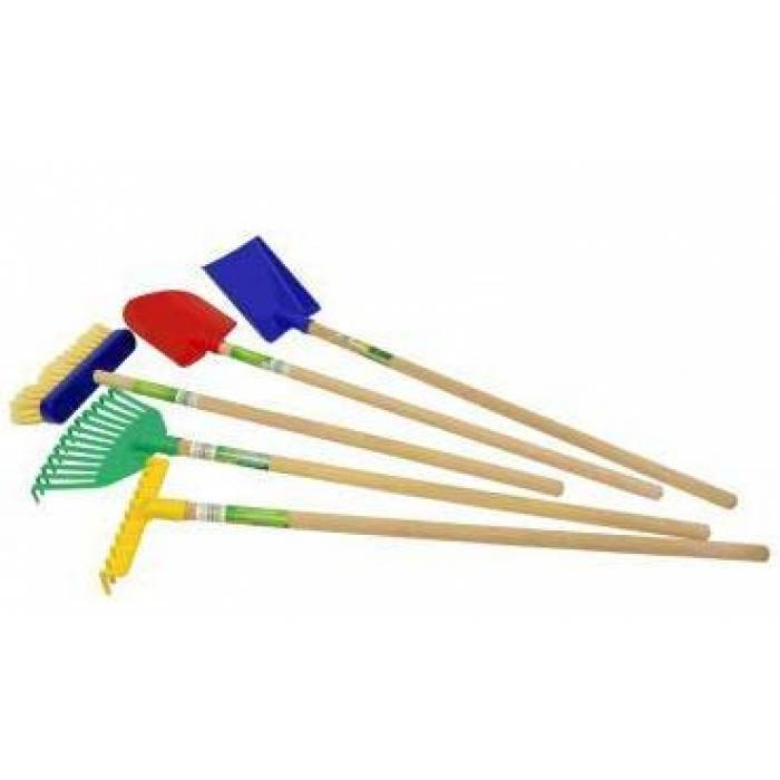 Sada dětského nářadí pro práci na zahradě. Dětská lopatka, dětský rýč, dětské hrábě, dětské švédské hrábě. Materiál tvrzený plast a dřevo. Vhodné pro děti od 3 let.