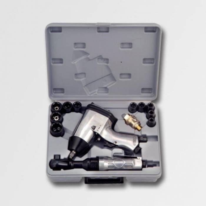 Výstupní čtyřhran 1/2", utahovací moment lze regulovat, uloženo s hlavičkami v plastovém kufru. max. kroutící moment 310Nm, hlavice 1/2" 9,10,11,13,14,17,19,22,24,27, ráčnový pneu. utahovák 1/2", nástavec 1/2"125mm; rychlospojka a mazací filtr, imbus klíč 4; platový kufr