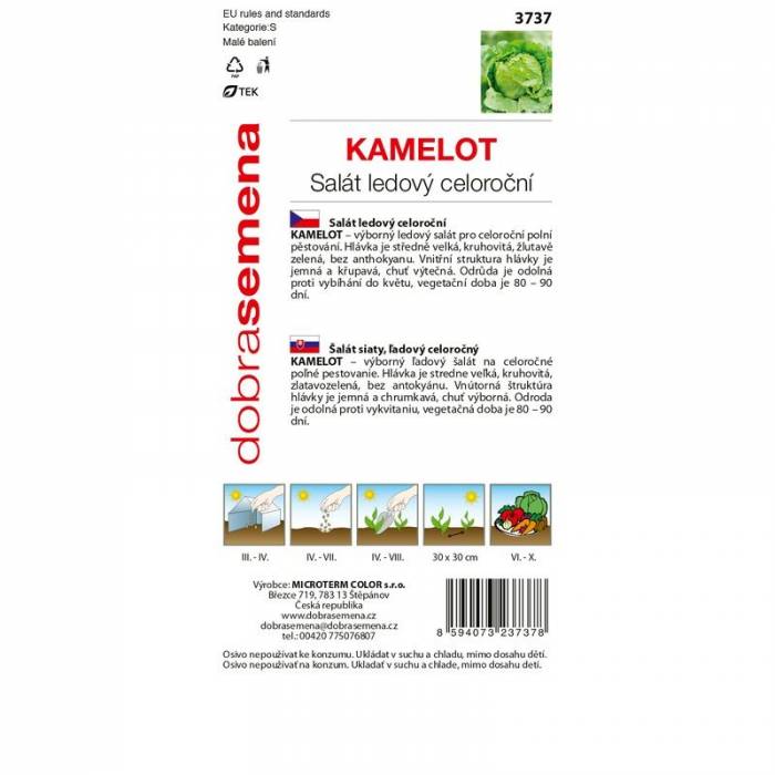 Salát celoroční ledový - Kamelot je výborný ledový salát pro celoroční polní pěstování. Hlávka je středně velká, kruhovitá, žlutavě zelená, bez anthokyanu. Vnitřní struktura hlávky je jemná a křupavá, chuť výtečná. Odrůda je odolná proti vybíhání do květu, vegetační doba je 80 ─ 90 dní.