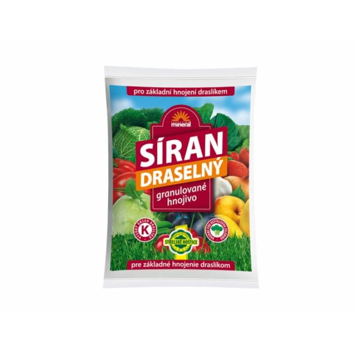 Síran draselný obsahuje vodorozpustný oxid draslíku, je vhodný pro kultury citlivé na chlór. složení: K2O 50 % Popis: Síran draselný obsahuje vodorozpustný oxid draslíku, je vhodný pro kultury citlivé na chlór. Vysoký obsah draslíku přispívá k vyzrávání rostlinných pletiv a zesílení rostlin. Použití: Síran draselný se nejčastěji používá při předseťové přípravě půdy, ke hnojení na podzim nebo brzy z jara. Používá se zejména ke hnojení brambor, slunečnice, zeleniny, vinné révy, ovocných dřevin a konifer. Dávkování: Listová zelenina: 20 - 25 g na m2. Košťálová zelenina: 20 - 25 g na m2. Celer: 50 - 60 g na m2. Cibule a česnek: 20 - 25 g na m2. Rajčata, papriky, okurky: 30 - 40 g na m2. Luštěniny: 20 - 25 g na m2. Drobné ovoce: 15 - 30 g na m2. Jádroviny a peckoviny: 20 - 40 g na m2. Jehličnany: 20 - 40 g na m2.