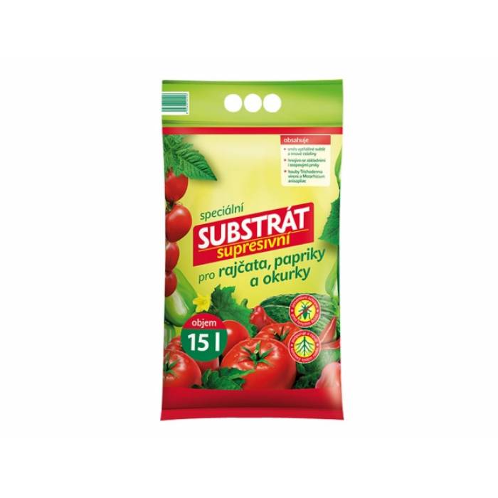 Supresivní substrát pro rajčata, papriky a okurky je speciálně určen pro pěstování uvedených plodin zvláště v pěstebních nádobách (truhlících, květináčích, mísách apod.) nebo na záhonech a ve sklenících. Je připraven ze směsi vytříděné světlé a tmavé rašeliny s upravenou pH reakcí. Substrát je obohacen hnojivem se základními i stopovými živinami v nezbytném rozsahu, což má příznivý vliv na růst a vývoj rostlin.