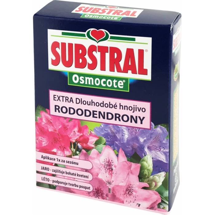 Extra dlohodobé hnojivo pro Rododendrony. Působí 5x déle a účinněji než běžný granulát. Bez rizika přehnojení. Substral Osmocote je hnojivo s postupným uvolňováním živin, které po jediné aplikaci zajistí rododendronům každodenní výživu po dobu až 6 měsíců. Je snadno aplikovatelné a velmi šetrné k životnímu prostředí, protože 80-90% živin se spotřebovává rostlinou. Každá granule je obalena vrstvou speciální rostlinné pryskyřice. V půdě dochází k narušení tohoto obalu vodou, která proniká do granule a postupně uvolňuje živiny ve formě přijatelné pro rostliny bez rizika jejich přehnojení a spálení. Rychlost uvolňování živin je ovlivněna také teplotou půdy. Prázdný pryskyřičný obal se ropadne asi za 1 rok. Hnojivo můžeme aplikovat od března pro podporu bohatého a dlouhotrvajícího kvetení na jaře. V létě svým působením podpoří dřevnatění výhonků a tvorbu poupat pro kvetení v dalším roce. Doporučené dávkování: odměrka = 10g