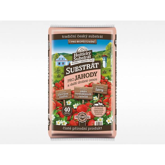 Substrát je vhodný pro jahody a další drobné ovoce. Je vyroben ze směsi světlé a tmavé rašeliny, jemné lávy, jílové složky a organického Hoštického hnojiva s mikroprvky.