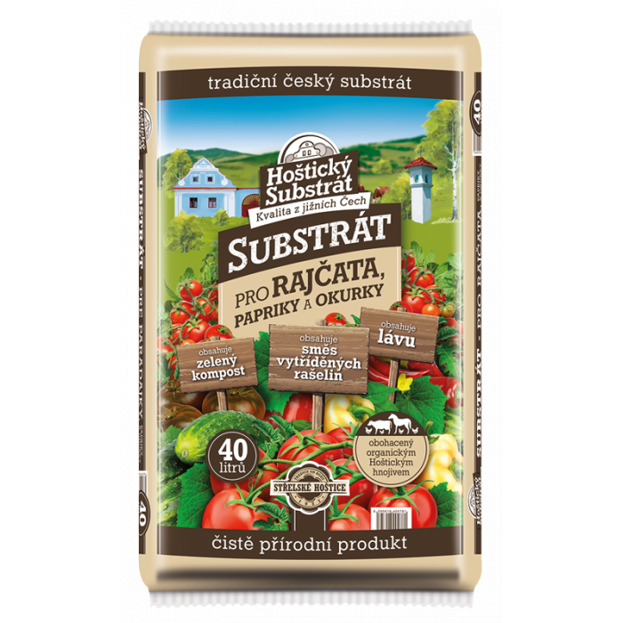 Substrát pro rajčata, papriky a okurky 40L je vyroben ze směsi vytříděné světlé a tmavé rašeliny, kvalitního vytříděného zeleného kompostu, lávy a organických hnojiv obsahujících všechny hlavní živiny i stopové prvky. Substrát neobsahuje minerální (průmyslová) hnojiva. Půdní reakce je upravena jemně mletým dolomitickým vápencem. Je ve formě mikrogranulátu, což zaručuje mnohem efektivnějšího rozmístění hnojiva v substrátu. Díky tomu je zajištěn rovnoměrný růst rostlin a tvorba kořenového systému. Přítomnost lávy má příznivý vliv na provzdušnění substrátu, čímž se zvyšuje přístup vzduchu ke kořenům rostlin. To příznivě ovlivňuje zakořeňování rostlin i rozvoj kořenového systému. Obsahuje potřebné množství základních i stopových živin.