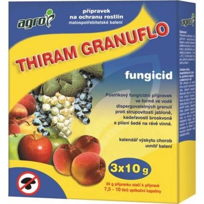 AGRO Thiram Granuflo je kontaktní fungicid s velmi dobrou účinností proti strupovitosti jabloně, kadeřavosti broskvoně a plísni šedé na vinné révě. Má velmi positivní vliv na vybarvení plodů. Ideálně se doplňuje s dalšími fungicidy např.u kadeřavosti broskvoně s přípravkem Champion. Je odolný vůči mrazu.