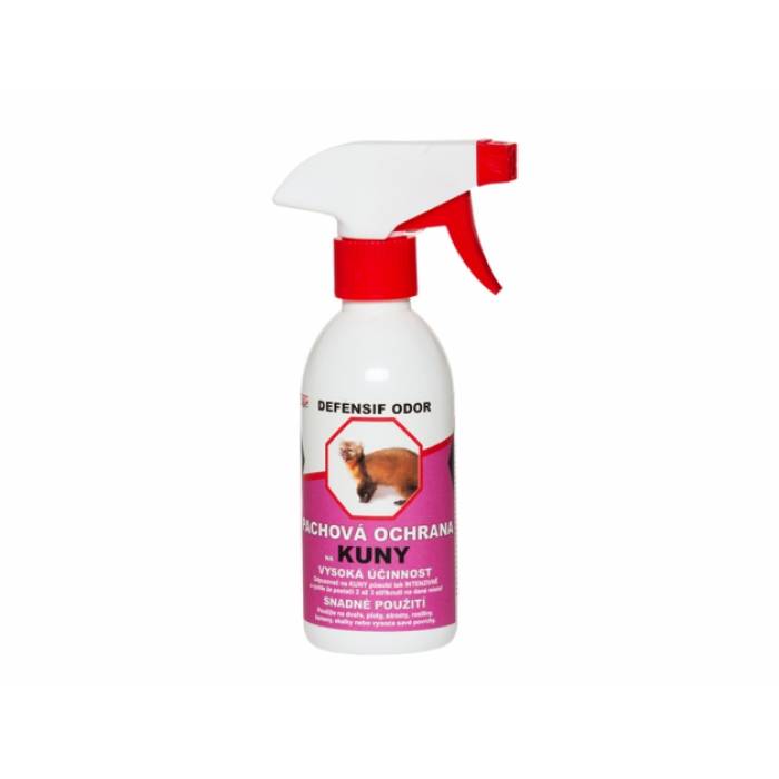 Pachová ochrana proti kunám. Použití: stačí 2-3 stříknutí na potřebné místo - dveře, plot, stromy, skalky… Balení: 200 ml.