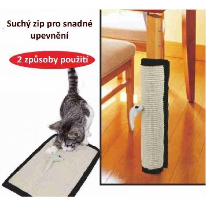 škrábadlo je vybaveno suchými zipy, tak aby bylo možné je upevnit na nohy stolu, židle, nebo jiného odpovídajícího předmětu. Ochrání tedy váš nábytek a zároveň ušetří prostor, protože bude sloužit namísto obvyklého škrábacího stromu.