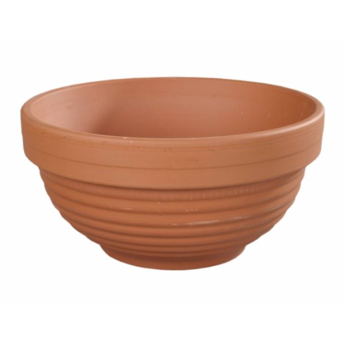 Terakotová kónická žardinka s kruhovým půdorysem, s vylisovanými pruhy po obvodu. Rozměry jsou: d. 23 x v. 11cm. Vyrobená z tradičního antického jílu s vyšším obsahem železa, proto je její zabarvení červenější. Vhodná do interiéru i exteriéru (mrazuvzdorná).