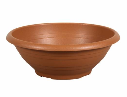 Plastová žardinka s hrubším povrchem je odolná vůči UV záření, počasí i nárazům. Je vhodná do interiéru i venkovních prostor. Barva: terakota. Průměr: 40 cm, výška: 16 cm.