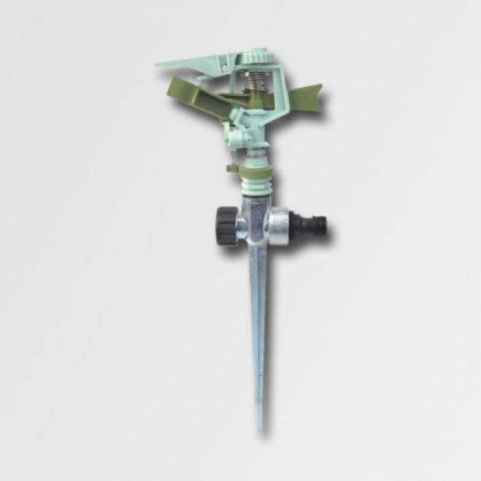 Plastový kruhový zavlažovač s možností nastavení kruhového výseku. Pozinkovaný podstavec s připojením na vodu.