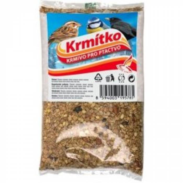 Zimní výživné doplňkové krmivo KRMÍTKO pro volně žijící ptactvo. Zvyšuje ptačí obranyschopnost a zlepšuje kvalitu peří. Skládá se z ovesných a pšeničných vloček, burských oříšků, rozinek, obilí a rostlinných olejů.
